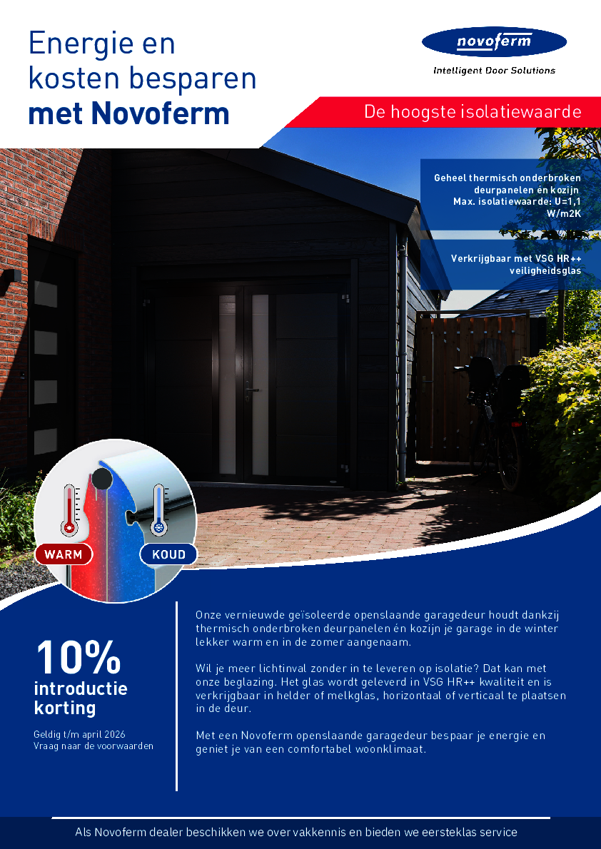 Steeds meer mensen kiezen voor een geïsoleerde garagedeur van Novoferm. Een goed geïsoleerde garagedeur zorgt namelijk voor een beter geïsoleerd huis en dat heeft veel voordelen. Het komt bovendien steeds vaker voor dat de garage meer is dan een opslagruimte. Isoleren is dan altijd een goed idee. Mensen brengen tenslotte veel tijd door op deze plek. Dan moet het er fijn aanvoelen terwijl er niet onnodig veel energie verbruikt wordt. Voor een comfortabele en energiezuinige garage is een geïsoleerde garagedeur de meest robuuste en mooiste oplossing.