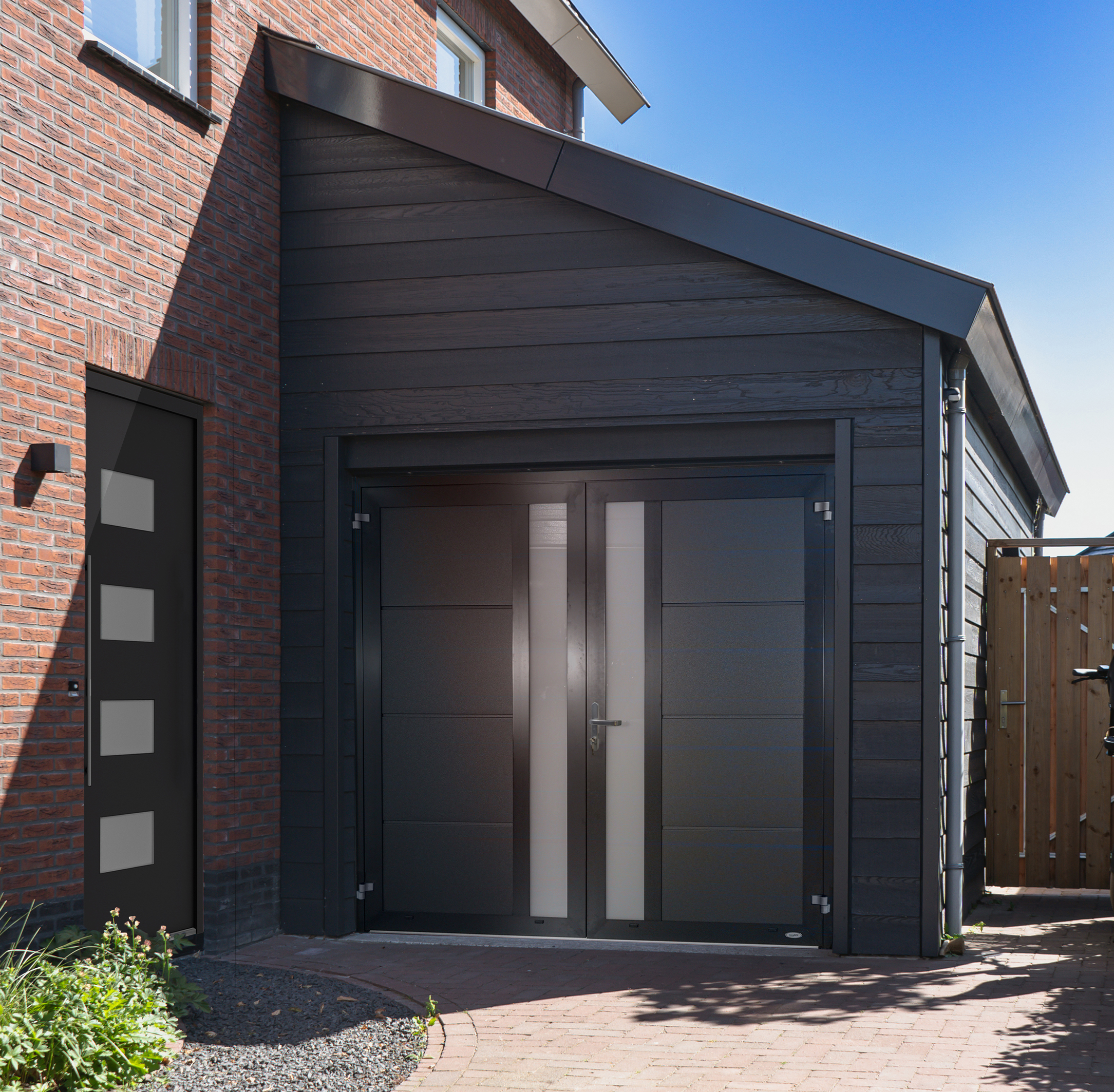 Ontdek hieronder de verschillende toepassingen en opties van onze openslaande garagedeuren.