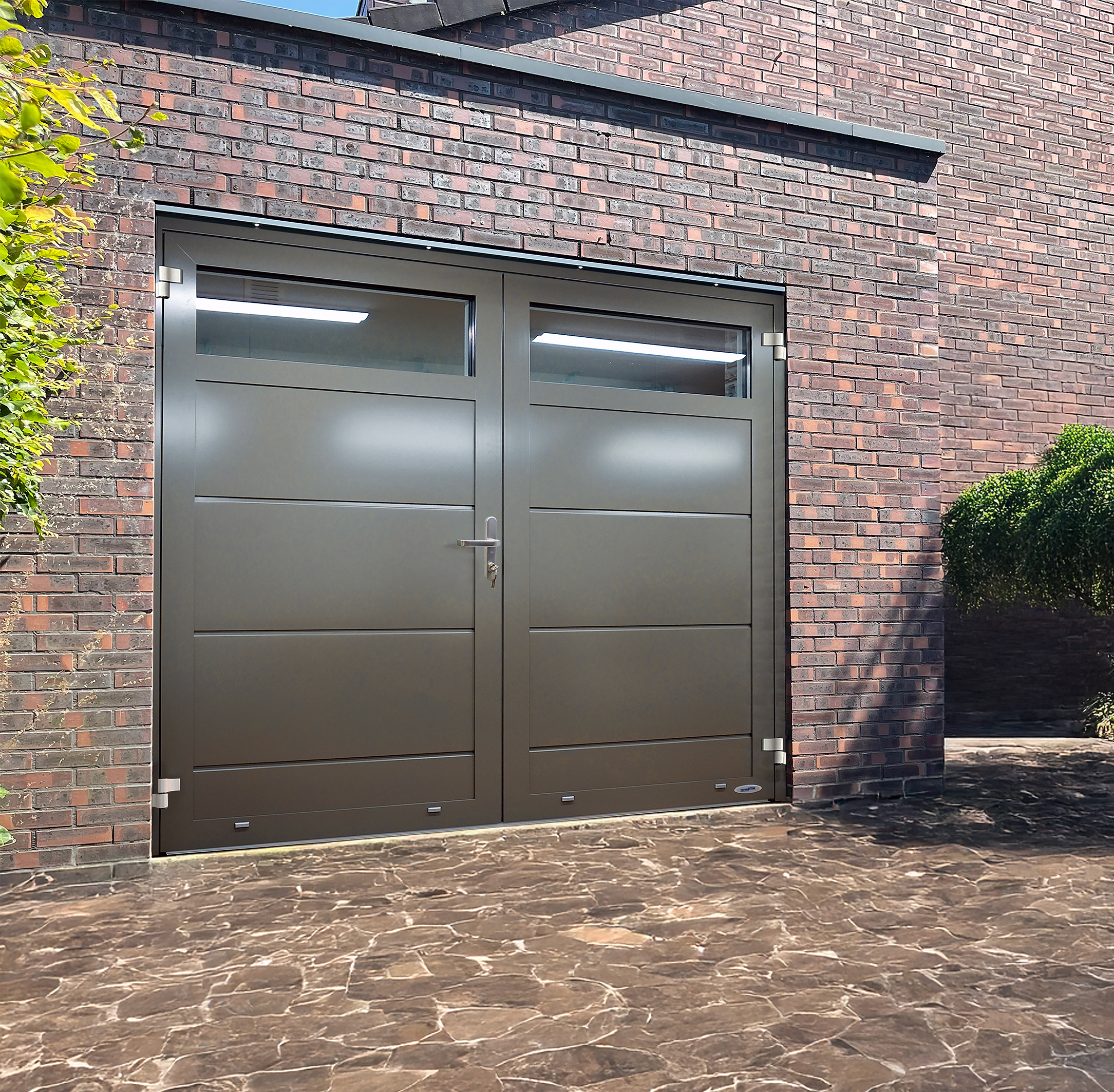 Openslaande garagedeuren zijn beschikbaar in diverse profileringen, dessins en kleuren.